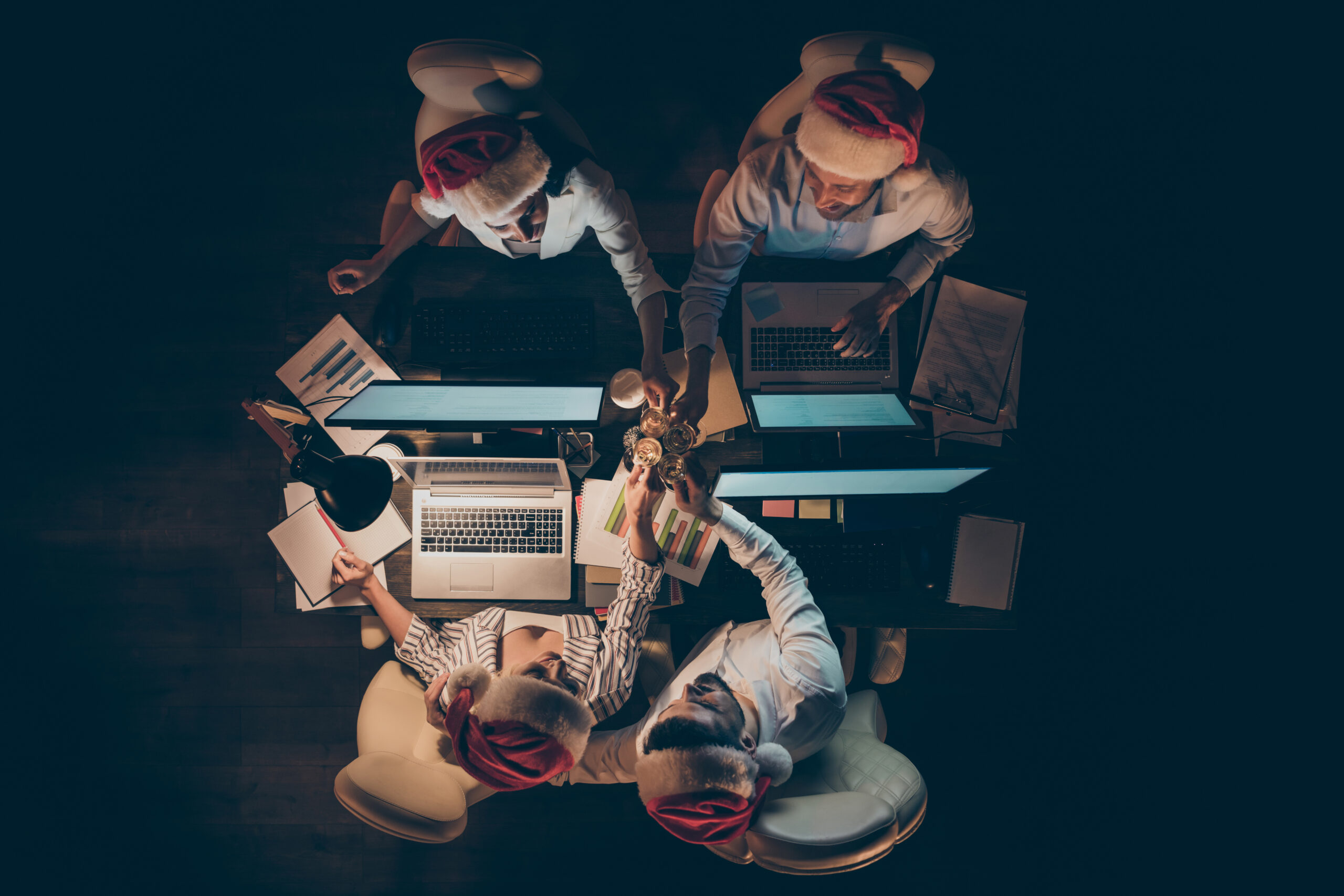 High angle above view photo of four business people working overtime meet newyear night together saying toasts raise sparkling wine glass wear santa caps dark office indoorsShareTweetShare