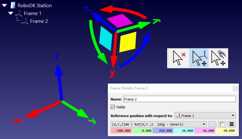 By default, the Generic XYZ convention is chosen for new reference frames. Try selecting different robot manufacturers from the drop-down menu above the colored boxes. Try entering numerical values into the boxes to see their effects on the reference frame.