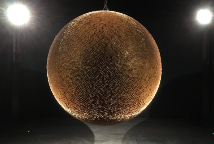 这件艺术品是一个悬浮球体,表面覆盖着4万枚抛光的铜制子弹壳,象征着过去25年间美国大规模枪击事件死亡人数的增长。为支持遏制枪支暴力的行动,《死亡之星II》作品销售收入的20%将捐赠给”每个城镇支持枪支安全”组织。