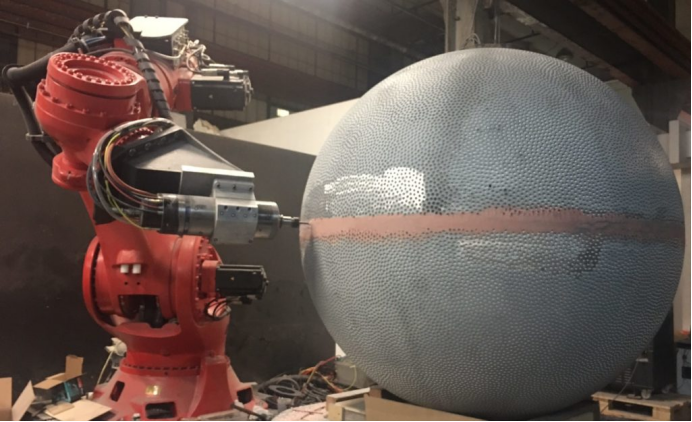 为了建造这个重达1吨、由子弹构成的球体,他们必须将球体分成两半制作。每个半球均由铸钢制成,这对于机器人钻孔工艺至关重要,因为它能使机器人的加工和钻孔过程更加稳定。在钻孔之前,每个半球都经过精密加工,以确保球面精确且完美无瑕。