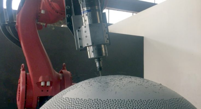 本次采用的系统包括KUKA Titan机器人(KUKA是当前最大型号机器人)、加工主轴和WEISS品牌回转工作台。为达到预期精度标准,还配备了Creaform C-Track光学测量系统。通过RoboDK软件进行机器人校准与离线编程,最终实现0.15毫米以内的校准精度,满足4万个钻孔点的公差要求。