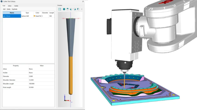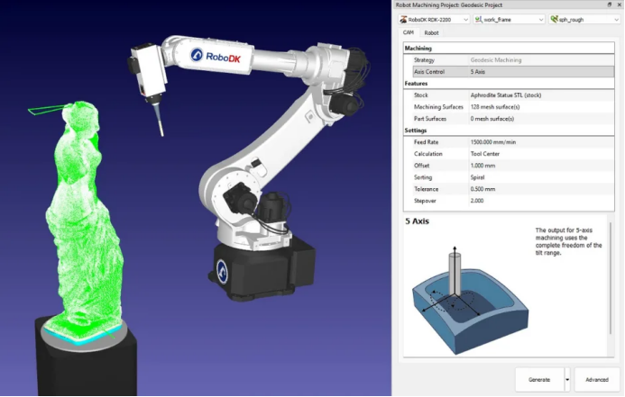 - 独立模式:RoboDK CAM可让用户在集成界面中管理整个机器人加工流程—从刀具路径生成、机器人仿真到代码生成。其核心功能包括高级曲面加工、精准毛坯跟踪及完整加工仿真。