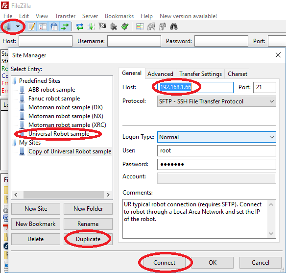 Recomenda-se instalar o FileZilla Client no caminho padrão ou diretamente dentro da pasta de instalação do RoboDK para que ele seja detectado automaticamente pelo RoboDK: