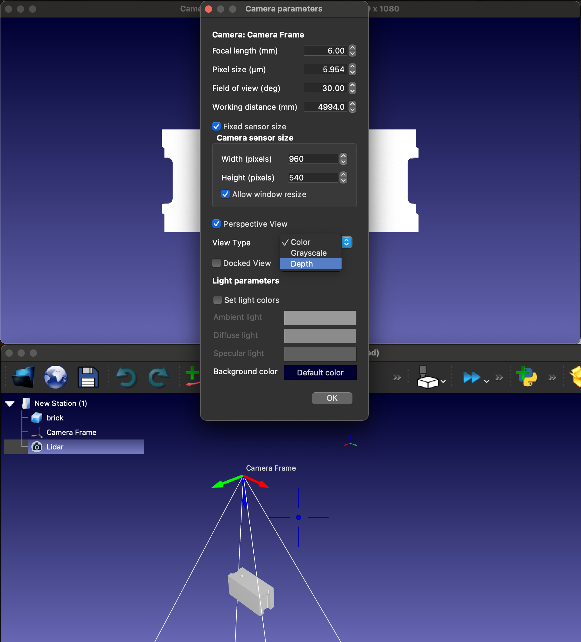1. Camera can see objects just fine with 'Color' view type (attachment #1). But when I change view type to 'Depth' (attachment #2) it crops the view field (see attachment #3). Code is here https://github.com/GRusar/robodk-camera-issue