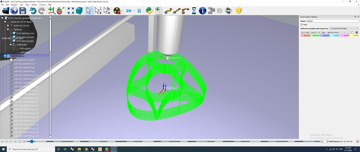 We are looking into ways to 3d print clay using a KUKA robotic arm. So far we have tried using embedded Slic3er in RoboDK, Machining Project using Gcodes obtained through the Cura slicer, and the RoboDK plug-in for Rhino to import a curve project.