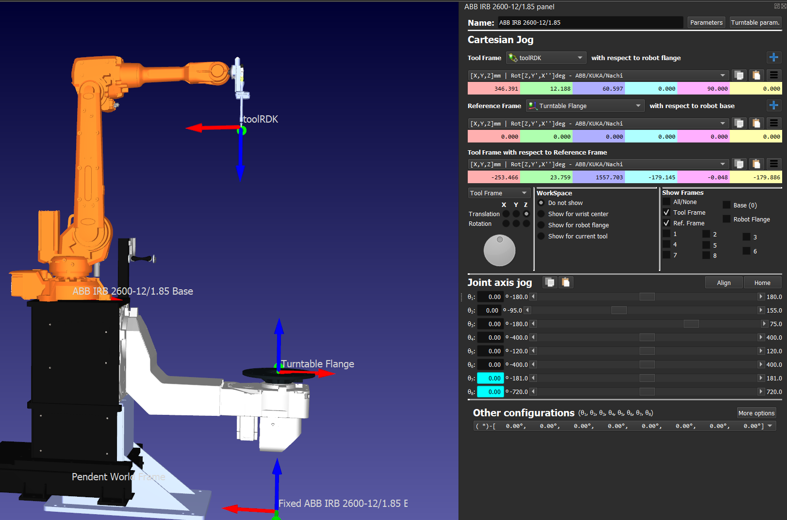 Trying to better understand and solve this issue so you can generate Cartesian targets, I believe we should review the root coordinate system of your turntable. To do so, you can add a coordinate system called Turntable Flange attached to the turntable and set to zero (all values of XYZWPR set to zero, as shown in the attached image and project). By doing so, you get the coordinate system shown in the attached image. Also, if your tool is set to toolRDK (as shown in the robot panel), you should see the same coordinates of the position of your TCP with respect to the turntable (for example on the robot teach pendant or RobotStudio). Is this the case? There is probably something different. My guess is that the turntable flange can be rotated by +/- 90 deg or 180 deg. Or it could be that the turntable flange has its own fixture defined. In that case, we should transfer the modifications you have to do to this Turntable Flange to the Tool pose of the turntable parameters (so it is part of the kinematic system).