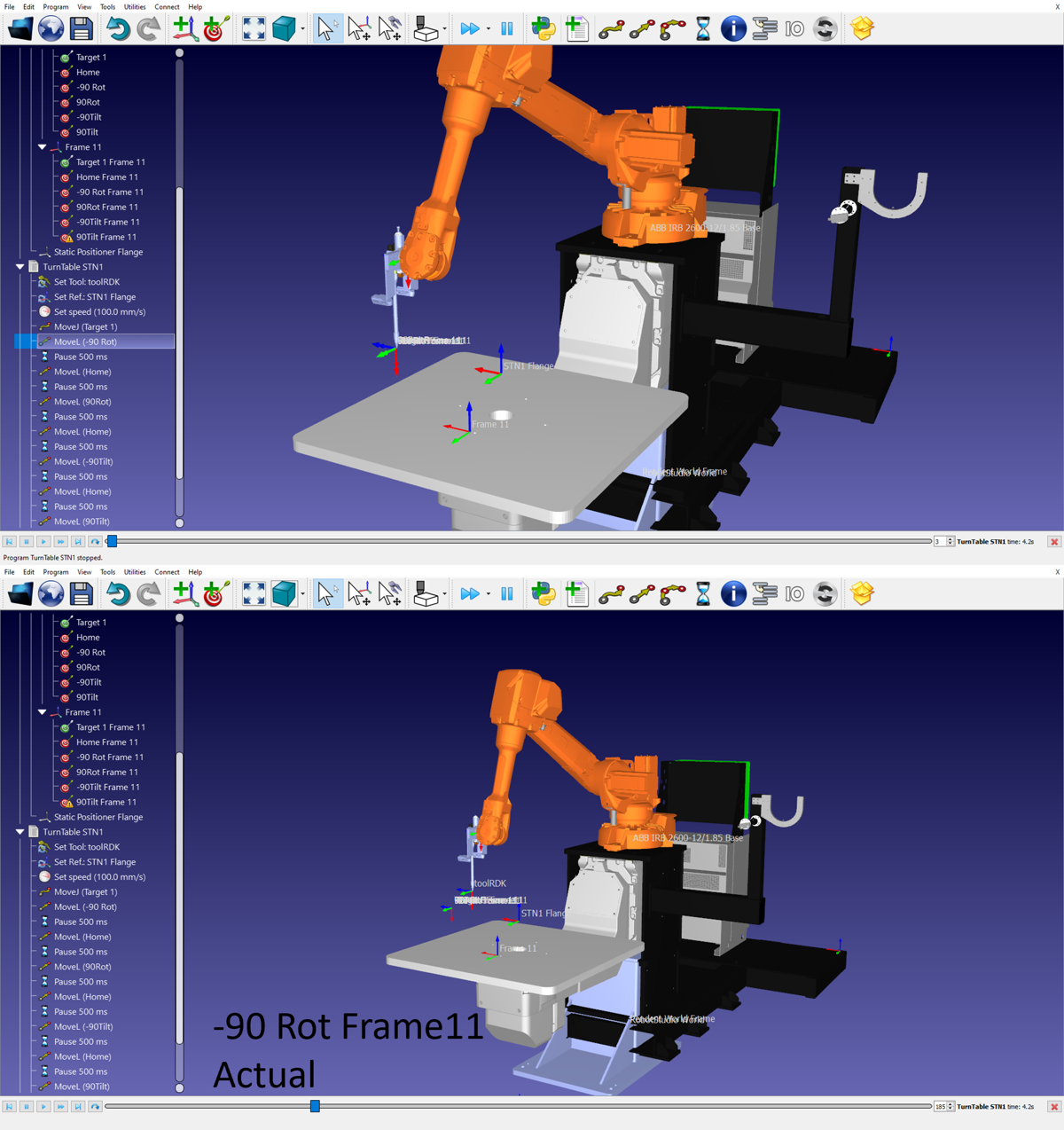 shows the -90 rotation of the TurnTableSTN1 program (first MoveL of program) comparing the programmed position (top) to actual position (bottom, read in from controller). Note the significant vertical offset.