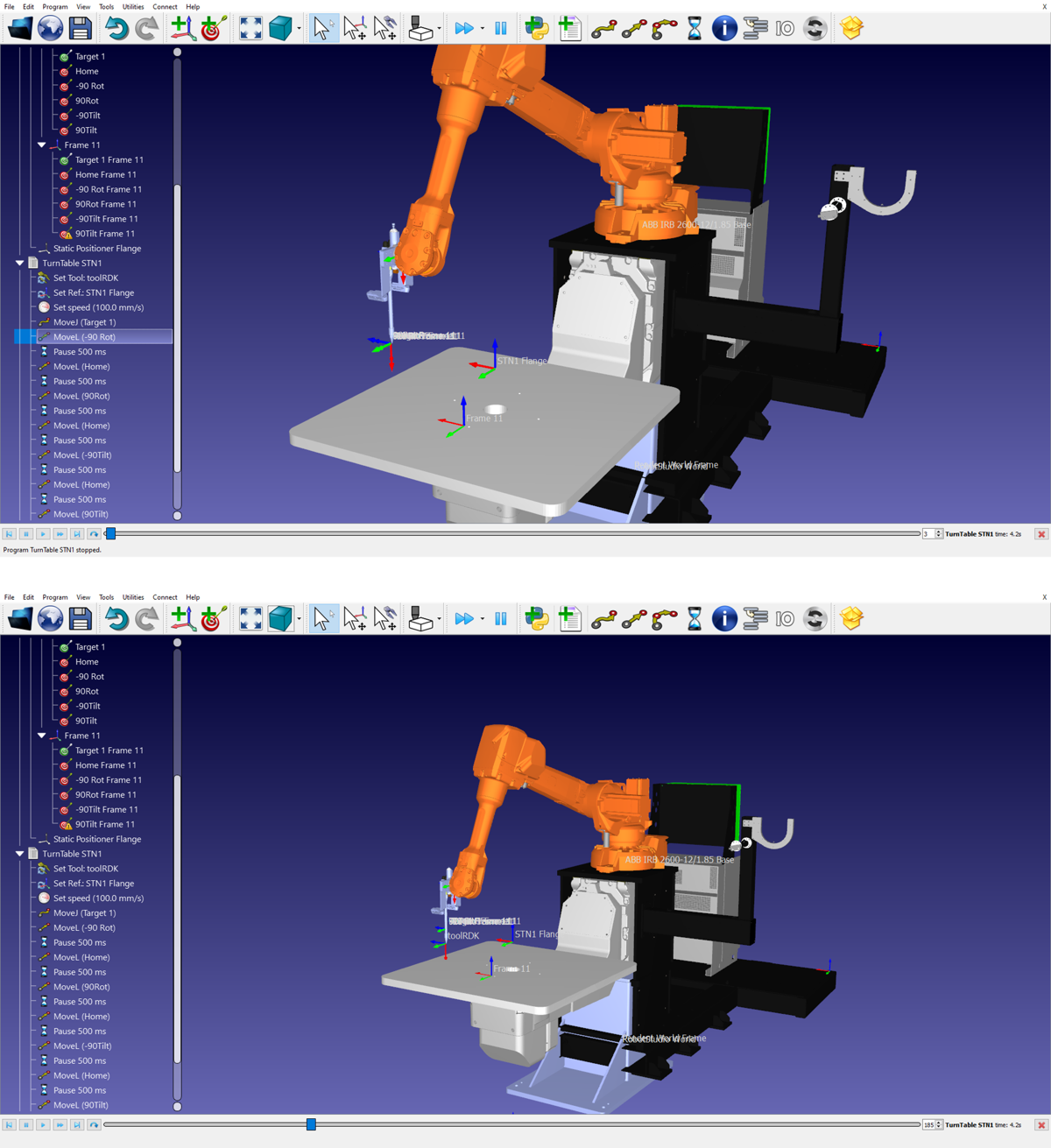 When I run TurnTableSTN1, the robot is close to the desired targets (offset in Y and Z per the MoveL vs MoveJ discrepancy). When I run TurnTableFrame11, the robot misses its targets by approximately the offset defined in the TurnTableFrame11 uframe. When I manually adjust TurnTableFrame11 to put the Frame11 offset from uframe to oframe, it behaves the same as TurnTableSTN1. RoboDK is not outputting the adjustment frames into the oframe as designed. Please advise on how to fix.
