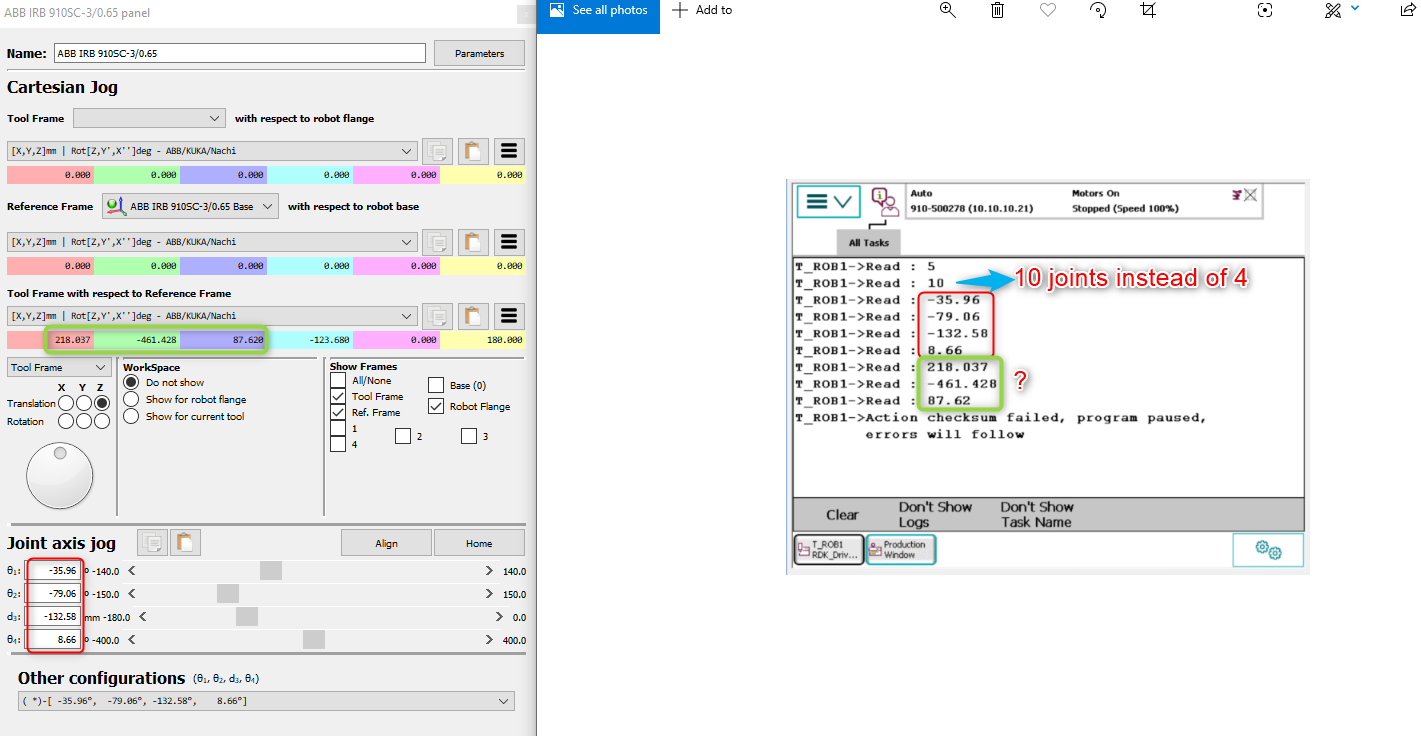 I'm trying to program online an ABB SCARA Robot (910-500278). I already run the module on the scara robot (Robotdk_Driver_Socket) and I got to connect with this one using RobotDK. As soon as I execute the first online movement, the module get stuck in the following message: "Action checksum failed, program paused, errors will follow". Image attached. Does anyone know why this is happening?