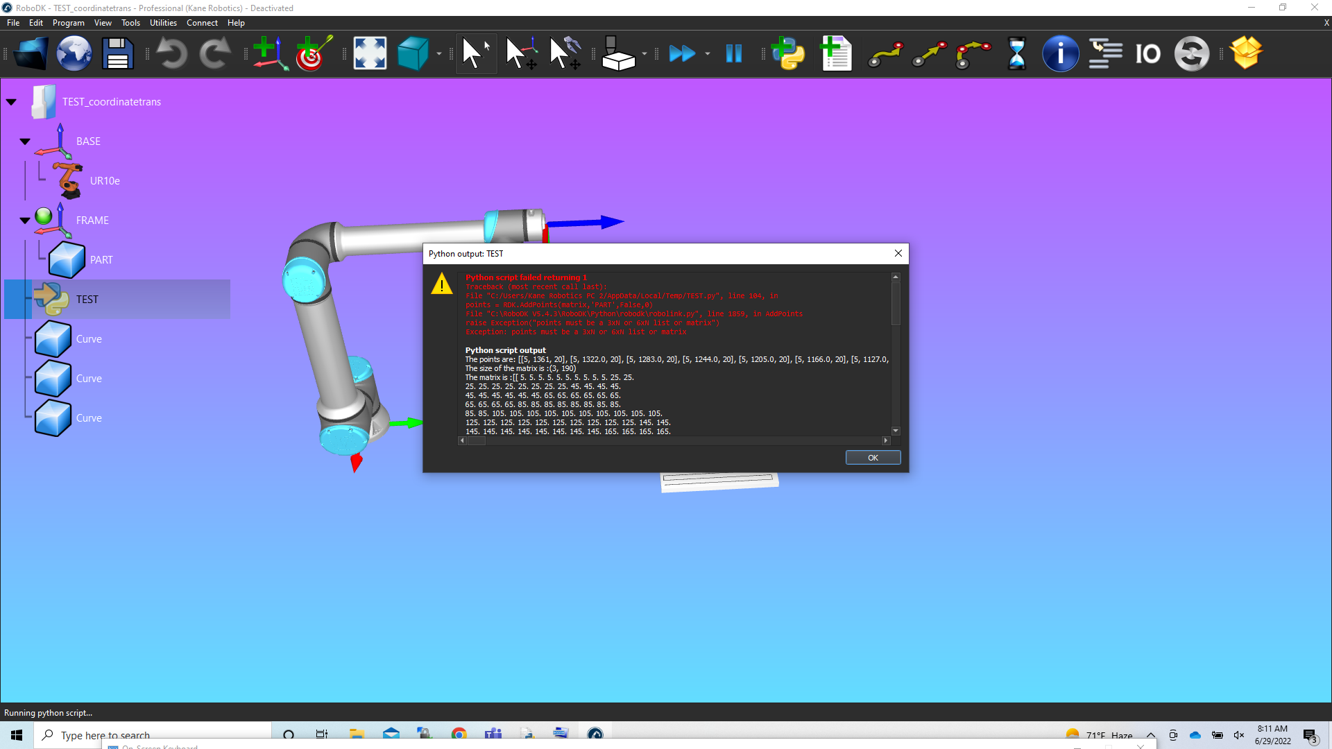 I'm trying to use the AddPoints() function from the API to add points to an object in my station. I have a list of points that were in a 1XN array where each element was a x,y,z coordinate. I used a loop to put the coordinates in a 3XN matrix since that is what the AddPoints() function accepts, but I'm getting an error from the script stating "points must be a 3XN or 6XN list or matrix". I have attached the error message and Python script.