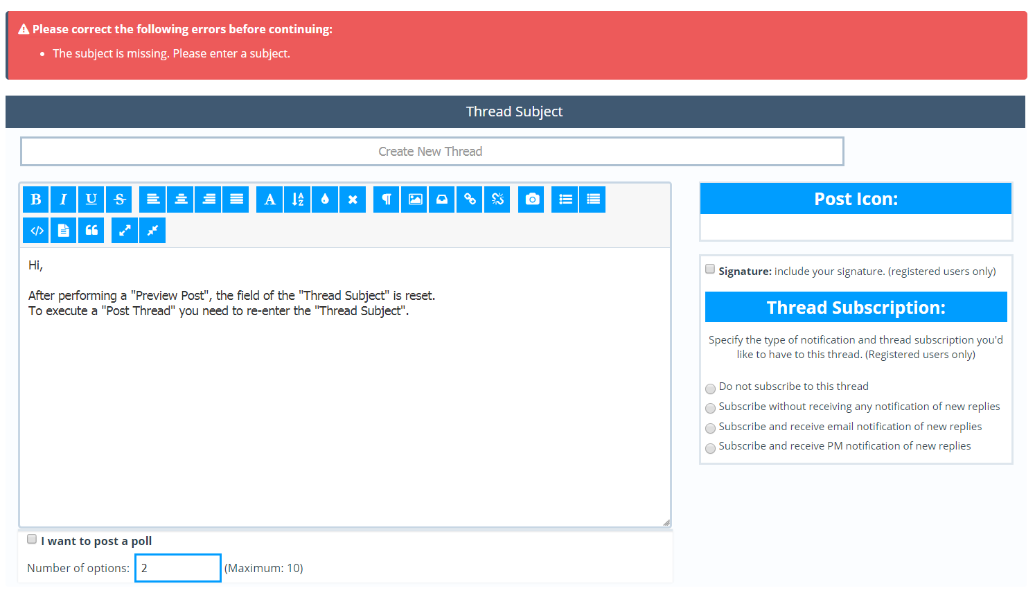 After performing a "Preview Post", the field of the "Thread Subject" is reset |