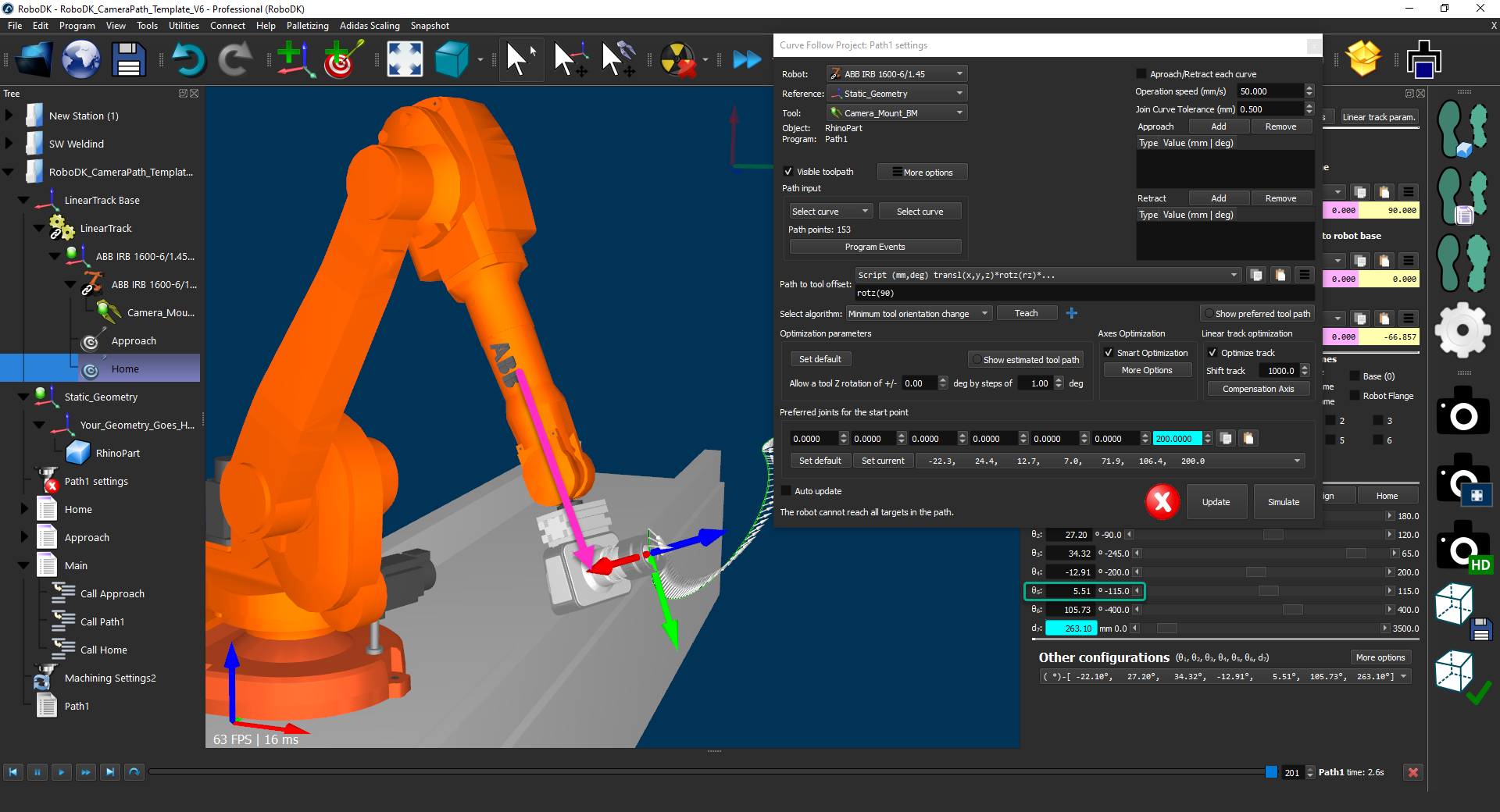 Hi, we are trying to create a camera path with our ABB 1600 and external track. We have it following a curve and reading the normals from a surface. However the z axis rotates as it moves tilting the camera. Is it possible to constrain the y-axis so that it can only rotate around the x-axis (perpendicular to the grounds x-axis). We will be generating the paths in Rhino and Grasshopper. I have started to play around with creating points, and creating surfaces for each point and aligning those, but so far the camera still points in the right direction but rotates around the normal. I have tried reducing the 'Allow a tool Z rotation' to 0, but then it can't compute the path. I have attached a simple path that tracks and pans but it will also need to tilt +/-90deg. Any guidance would be appreciated.
