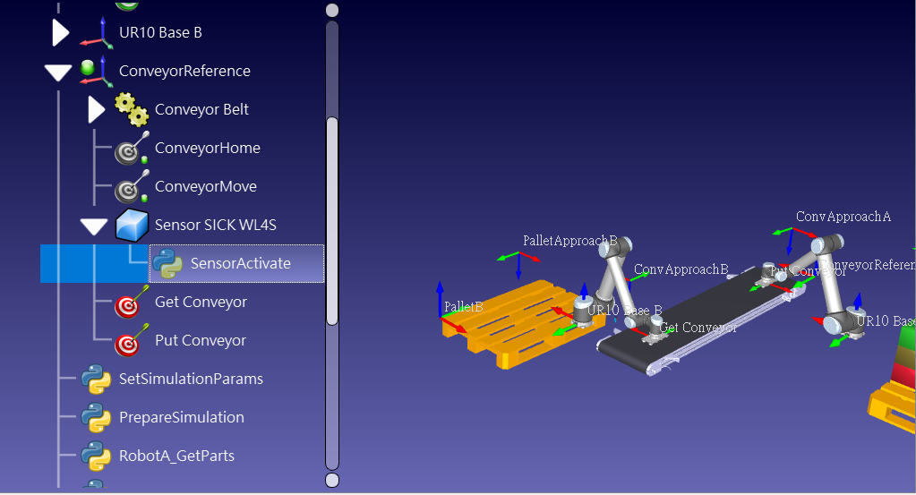 In the example file, "Example-06.d-Pick and place with laser sensor", the Python program "SensorActivate" is attached under the object "Sensor SICK WL4S".