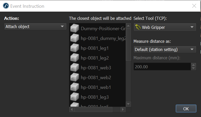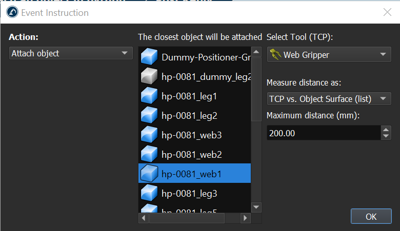 I'm encountering an issue where my program event attach instruction is attaching the incorrect object. Object B is closer to the tool tcp, but I actually want to attach Object A. We have quite a few objects clustered together and I need to be able to specify the exact object I want to attach.