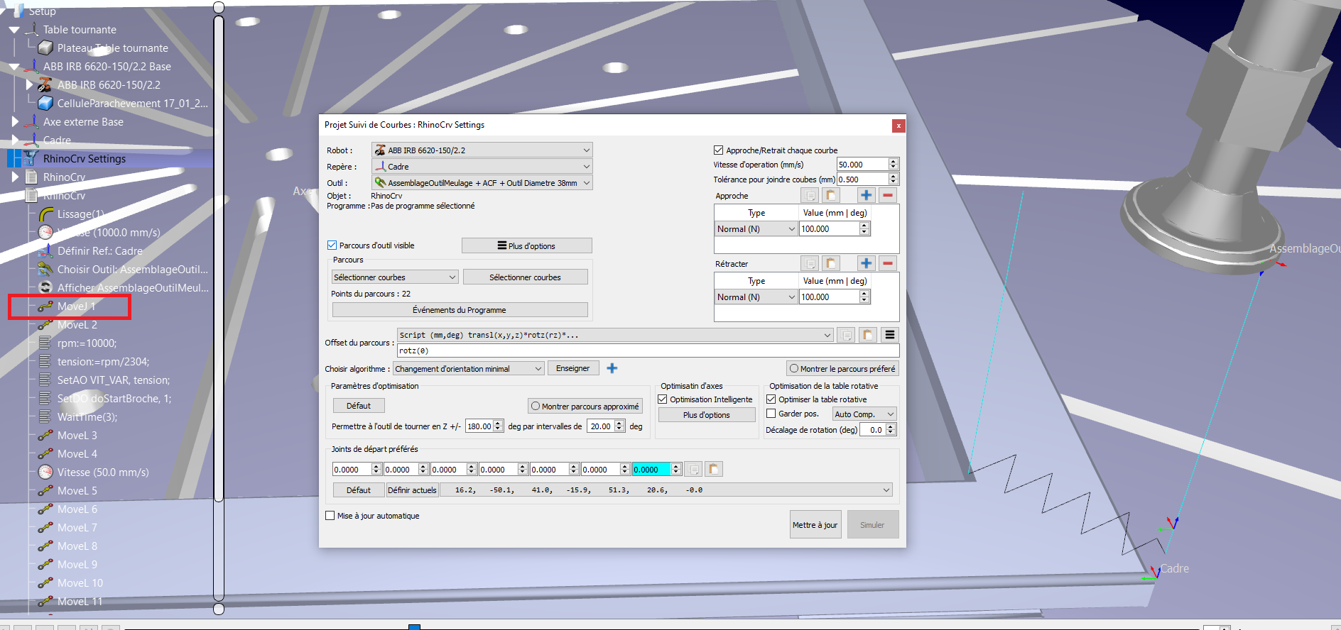 The reason I want to use a moveL is that to avoid any issue of calibration between 3D simulation and real cell, I work in a local frame associated to the part, and the initial moveJ does not place the robot above the starting point but a bit far away making it unsafe to use.