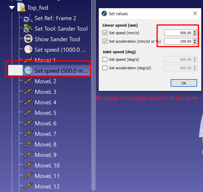 I am wondering, is there a way by using python script to insert the 'set speed' command to certain points automatically? Like there is a for-loop to insert the 'Set Speed' and 'Set acceleration' values into 50, 100, 150, 200 ..... points respectively?