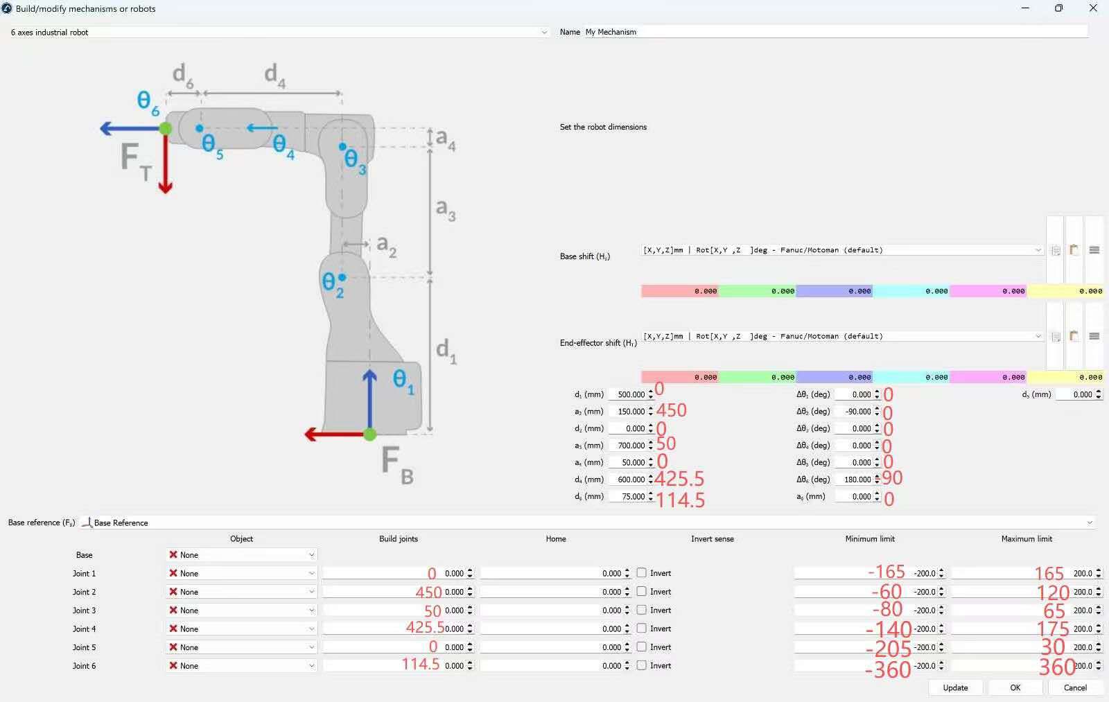 When I try to do it following the measurements I did on my own using Solidworks meaning d1= 345.762, a2= 0, joint 1 and joint 2 rotate correctly, the others ones do not, but I measured other dimensions and I believe to be a3 = 450 mm, the other ones I am not sure about but the client claims they are: d4: 425.500 and d6: 114.500. I have been scratching my brain as to how to do this, but I still have nothing.