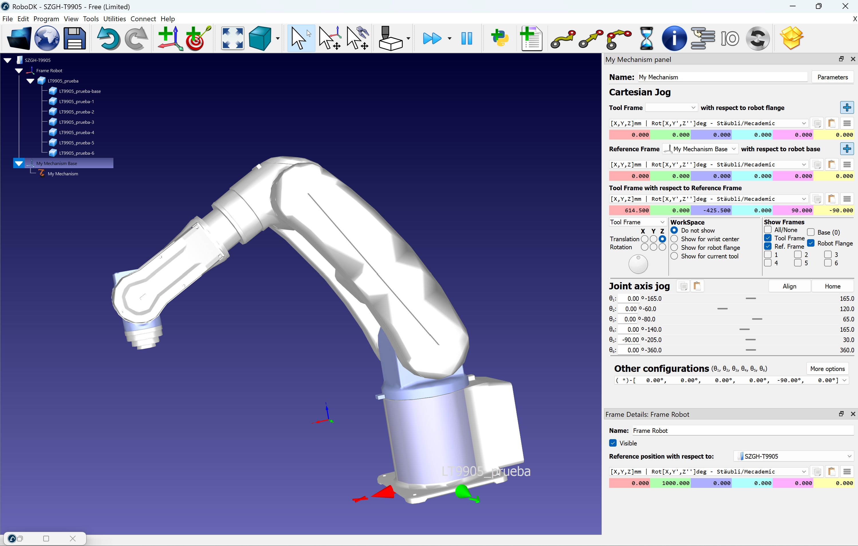 Here is a photo of my robot, as you can the base reference frame I used is at the bottom of the robot with the correct orientation and z axis going into it, I know it may have something to do with the reference frames of each individual object, but I splitted STEP file in robodk, I am not sure how I should approach changing the reference frame of each object. I would appreciate it if someone has any input on the subject, let me know if I am missing any relevant attachments. Thank you.