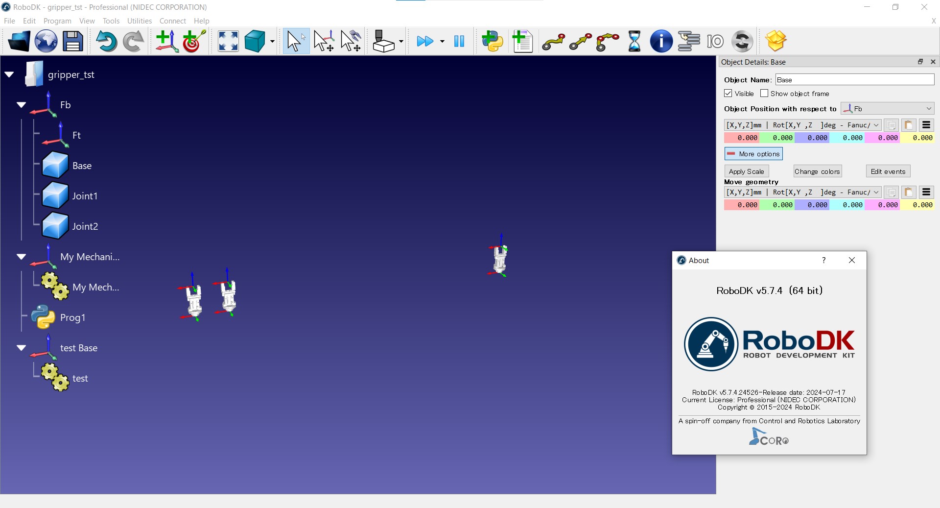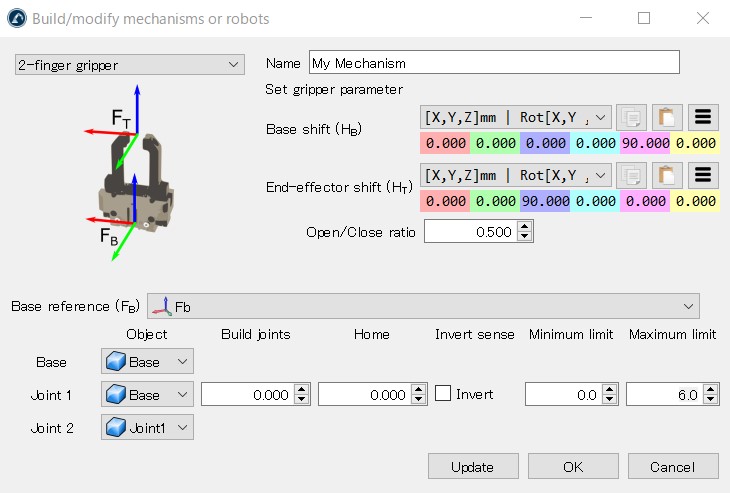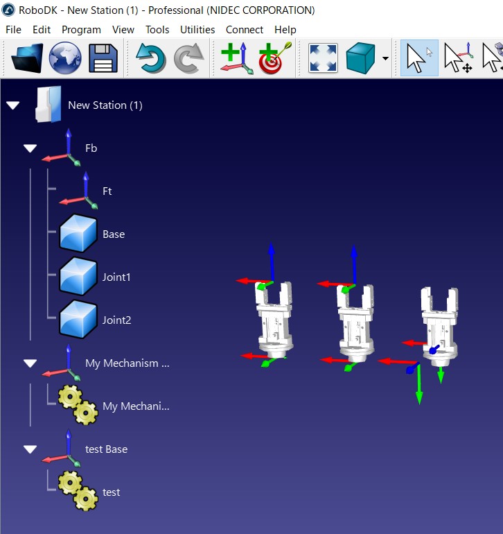 In the diagram below, the gripper on the left is the original object, the one in the middle is the mechanism set up with the UI, and the one on the right is the mechanism set up with the API.