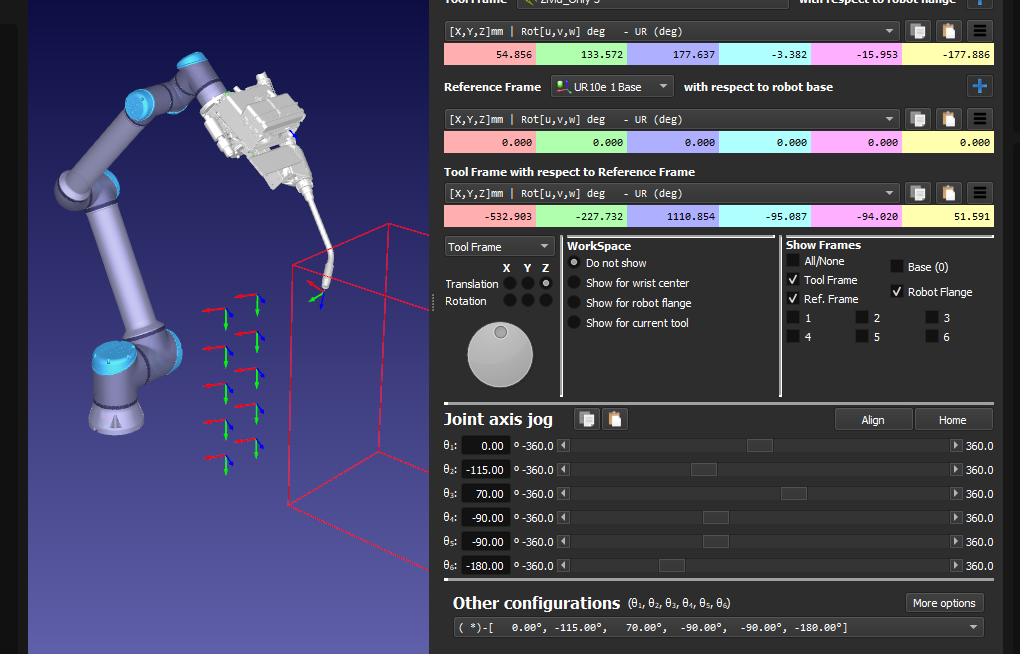 I've attached an image of the poses which the robot will need to perform SolveIK on with the TCP that it is using. All the joint limits are set to it's default -360 and 360. The poses' frames are relative to the robot's base as well.