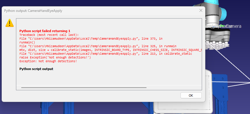 I also tried running CameraHandEyeApply which fetches an error (screenshot attached) which I am not able to resolve. What should be the next steps.