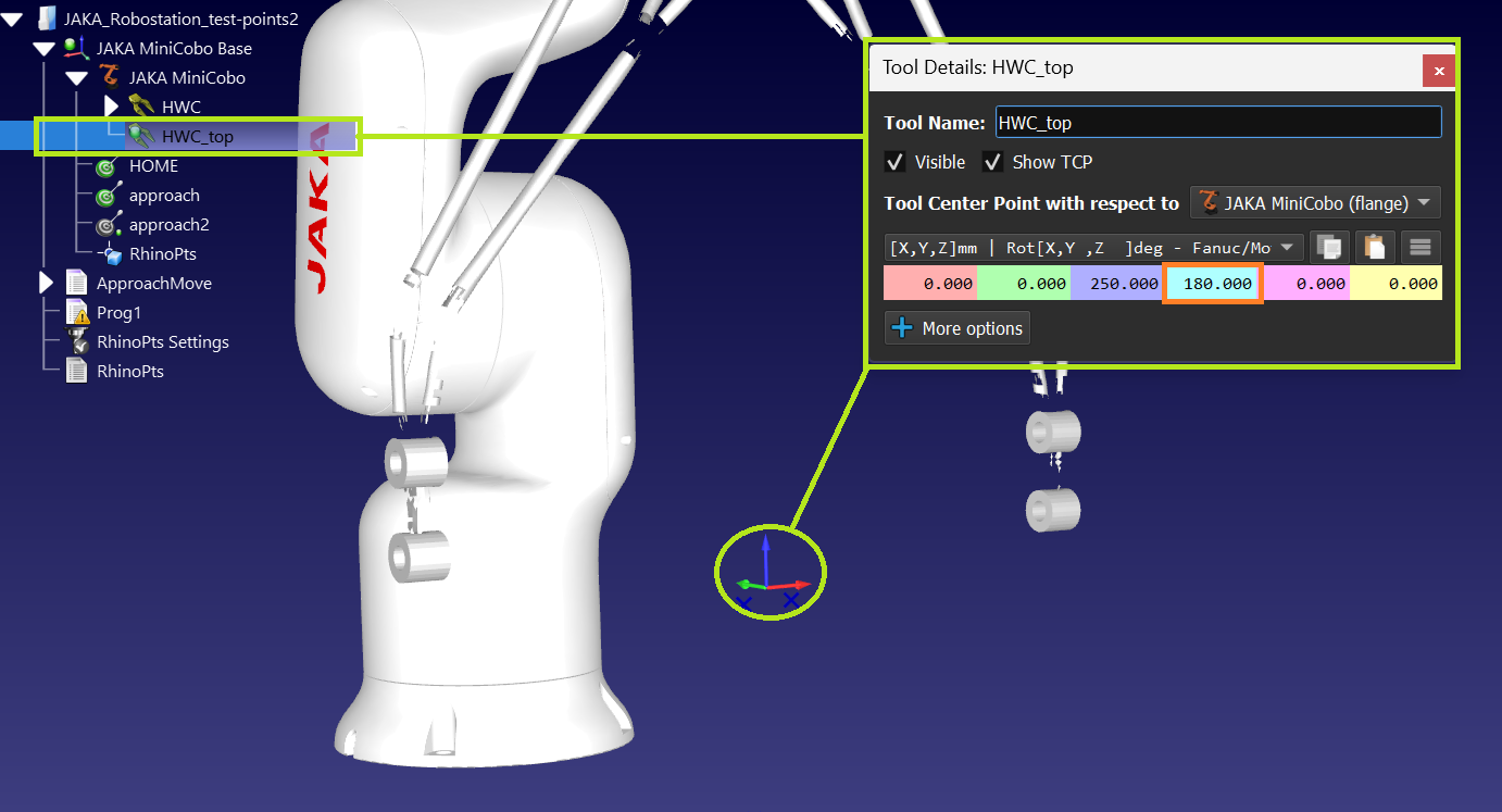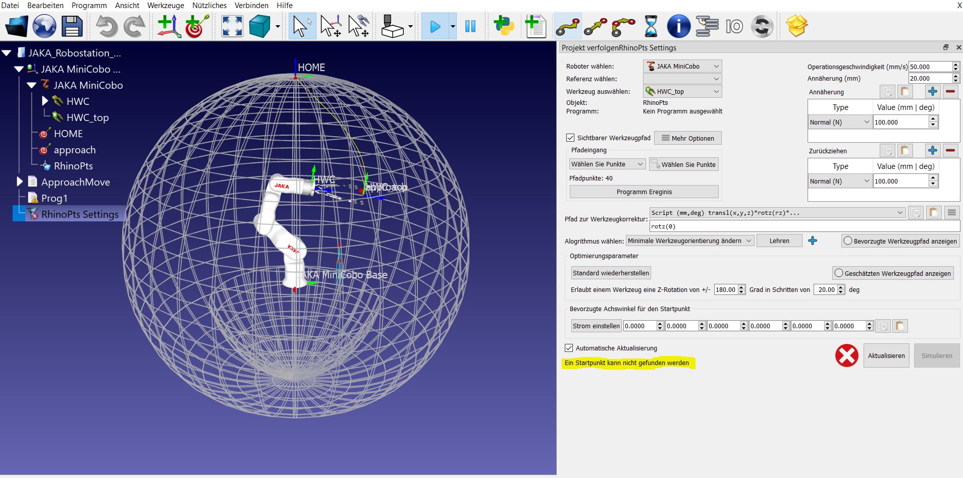 The program reported this error: Start point could not be found. In Grasshopper I also get the message: Can't simulate or generate programs because the robot can't reach the start point. However, the simulation in Grasshopper shows that the points a recoverable.