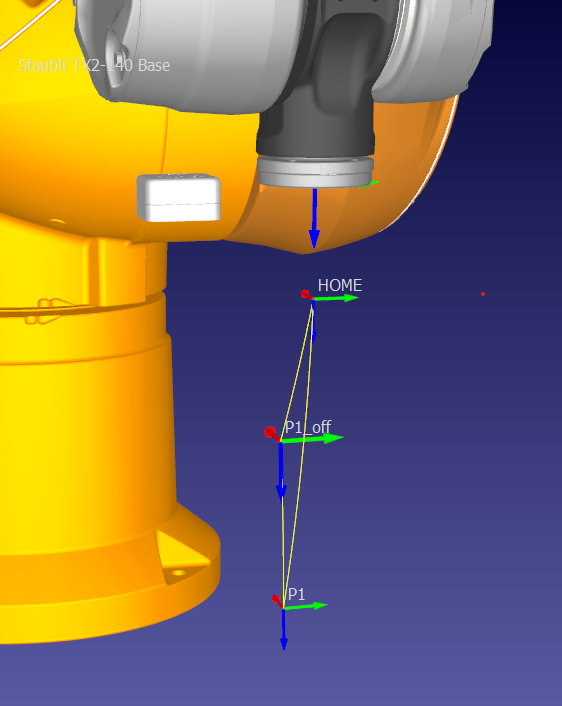 I can move from HOME to P1_off without problem. The problem is that I try to move from P1_off to P1. P1_off is the same point as P1, with a Z negative offset. If a Define P1 as axial target, I can move from P1_off to P1, but if I define it as Cartesian target, as result I have that P1 is not reachable. I would like to have as cartesian target. Any ideas??