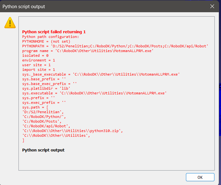 i wanna update pulse/degree of my robot, MH80. i followed these instructions,  https://robodk.com/doc/en/Robots-Motoman.html#Motoman. but, when i drag and drop file ALL.PRM, it couldn't happen as like that and appear python error. could you help me with this? and I want to set configurations of the robot in the menu "other configuration". in more options, I set it in configuration Front-Elbow up-Non flip. but, it cannot save the configuration as I want to. do you know how to set the configuration