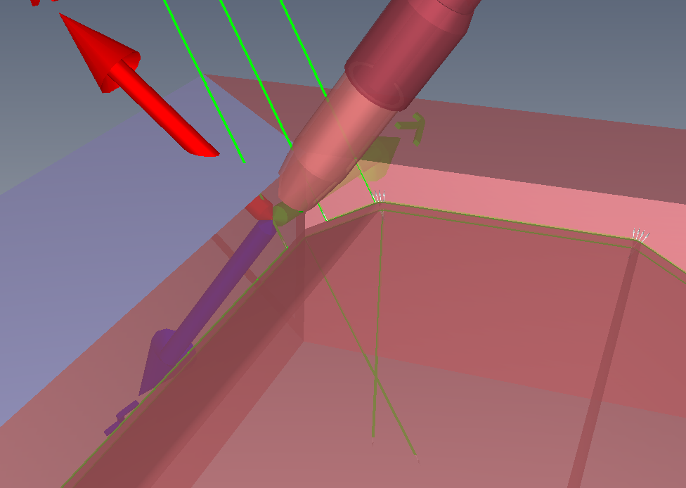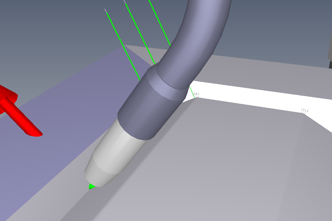 When the robot finishes welding this path, the robot goes uphill. How do I fix this? I want it to go out of the place it is welding an not crash when it moves out. instead it crash straight into the side as shown in picture 2.. I use "curve follow project" to select path .. (I can not adjust the angle more because then it will crash to the component while welding)