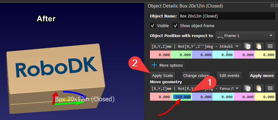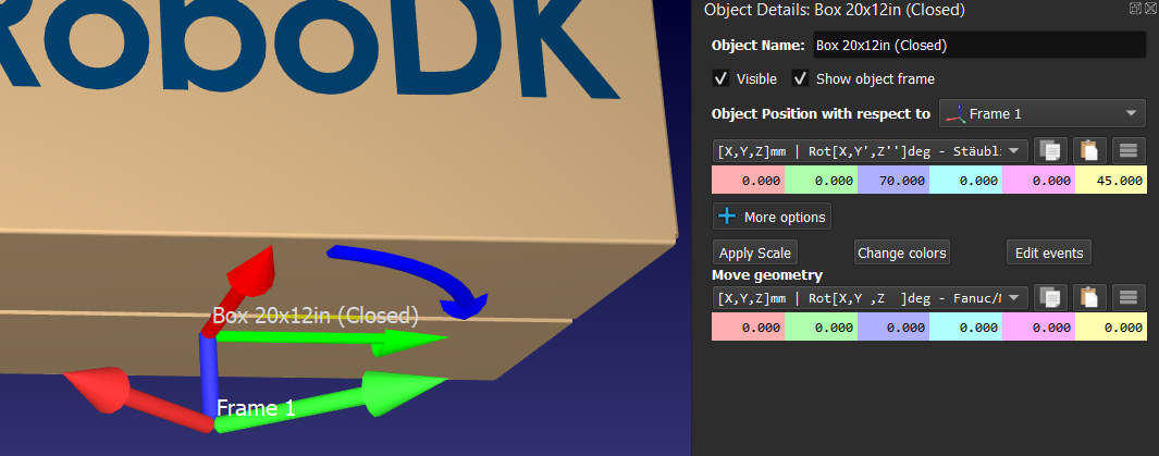 When you adjust the position and rotation of an object in RoboDK, the pose you are defining is the Object reference (the origin of the part). This means that the "pivot point" or apparent center of rotation is actually the object reference.