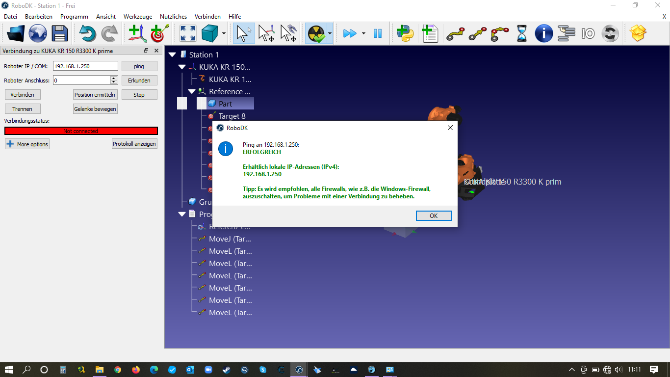 The goal is to move the robot via RoboDK. When this works I rebuild the cell and import the CAD-data and calibrate everything.