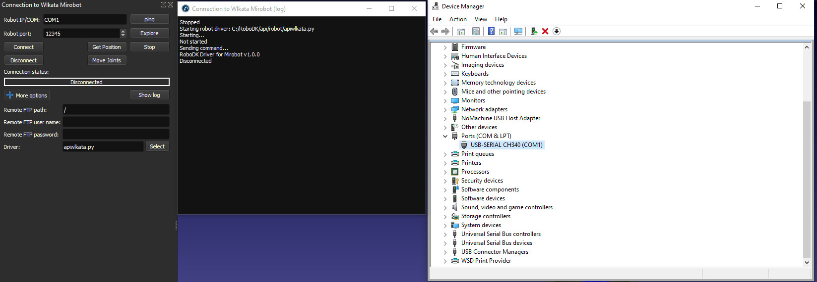 Attached is an image of Robot IP/COM as COM1 as listed in Device Manager. The log is also shown, which shows that it disconnects by itself. Am I missing something else?