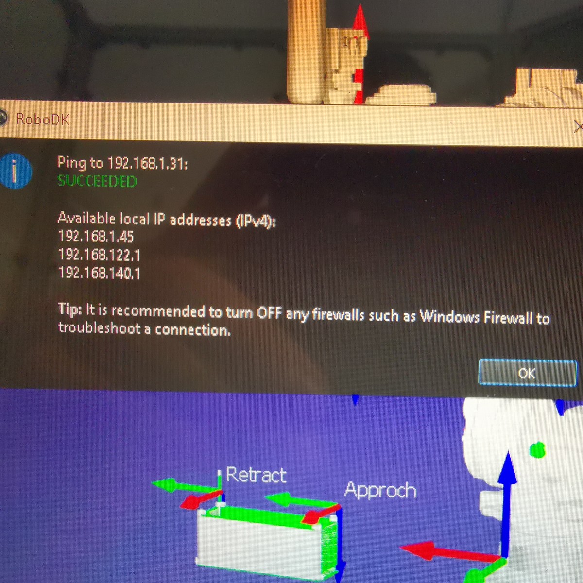 As you see in the photos, the Ip address of Robot 192.168.1.31, and for my computer 192.168.1.45.