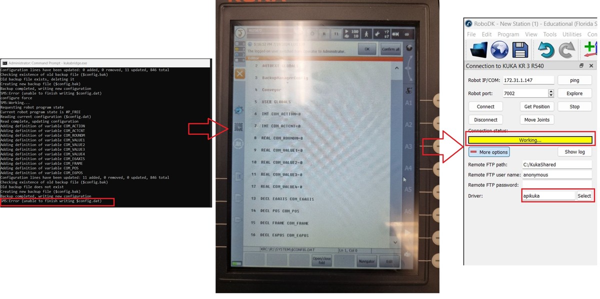 I tried to connect my KUKA robot (KR-3-R540) to RoboDK, I reviewed the documentation and also the following threads. To the best of my knowledge, I followed every step and unfortunately, I couldn't get the connection. the only thing that I haven't tried is changing the port number. I would appreciate any assistance on this issue. I have attached the errors for reference.