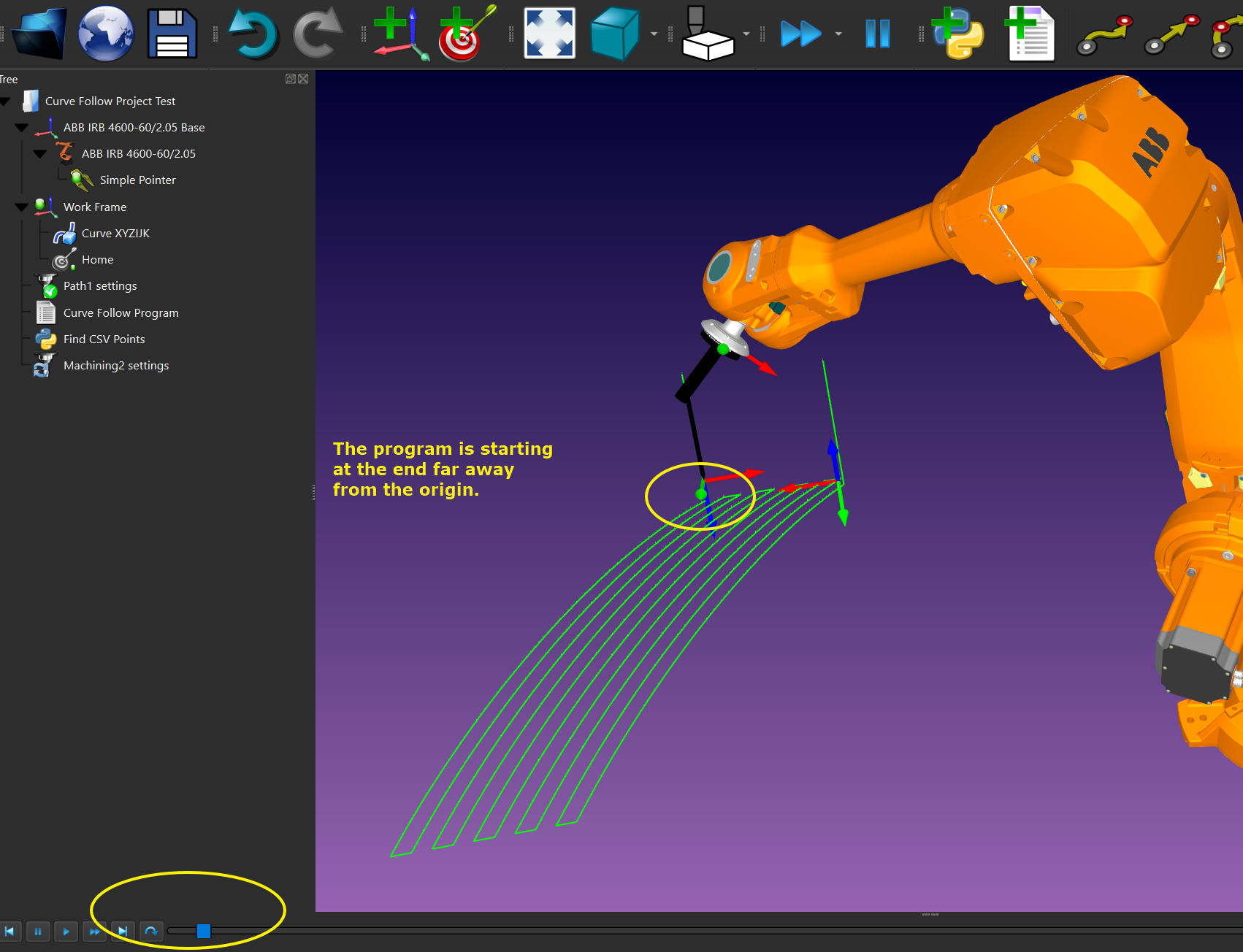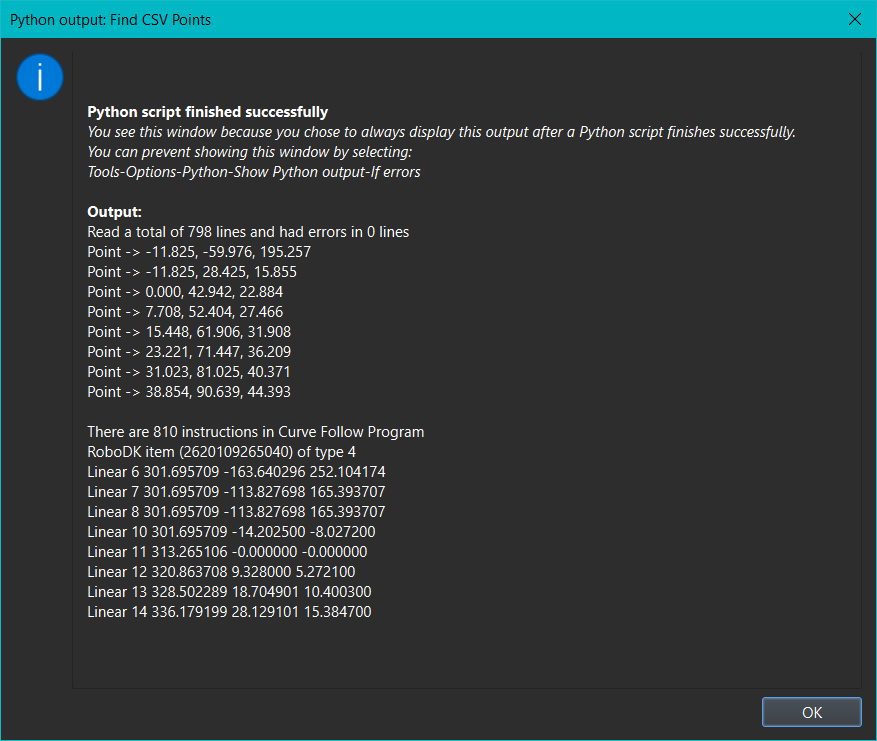 When I drag and drop a CSV file into RoboDK I get a curve item. When the Curve Follow dialog creates a robot program based on that curve, that program starts at the last point in the CSV file and moves towards the first point in the file. I expect that the robot should follow the CSV points from top to bottom. I don't know how to check if the issue is the CSV to curve process, or the robot path along the curve process.