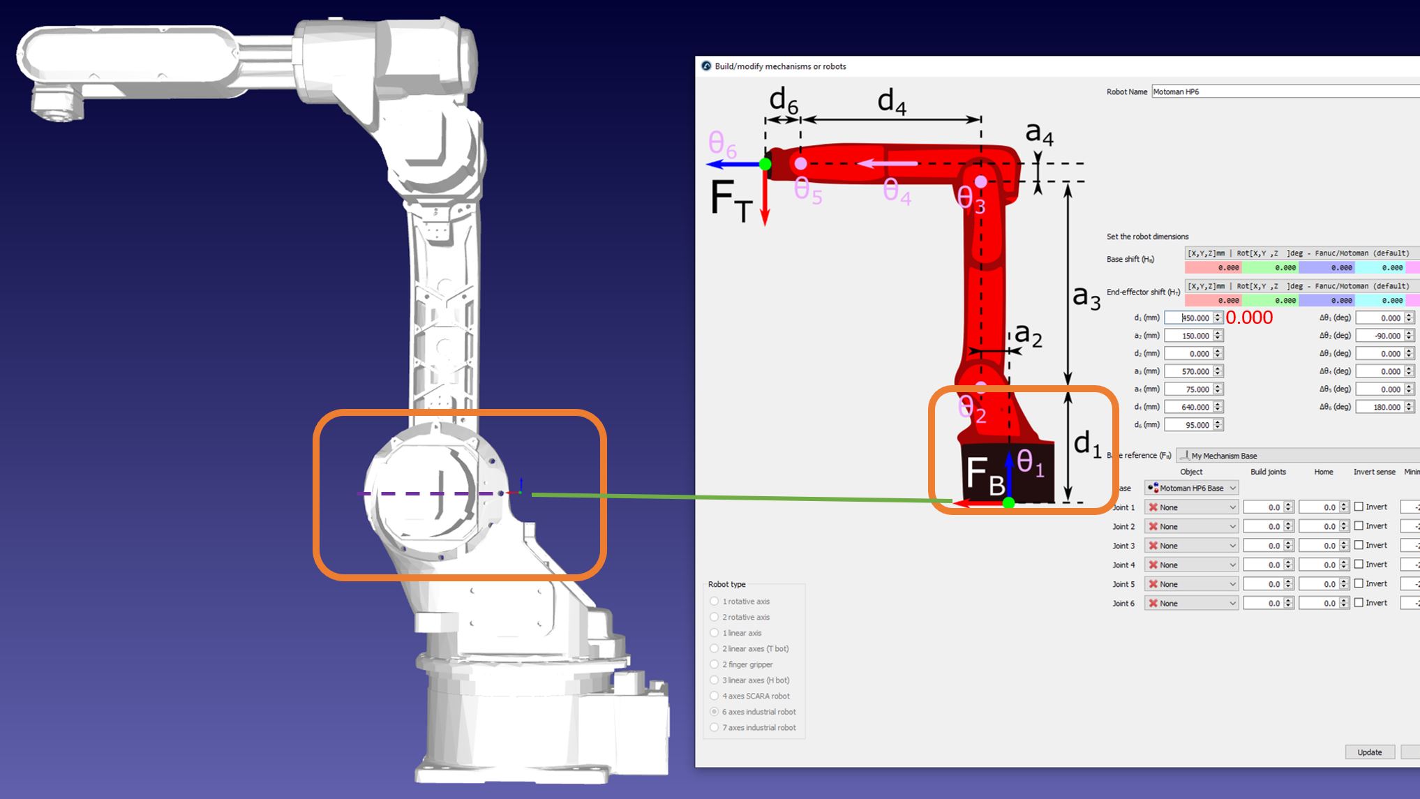 The distance d1 is not calculated from the physical bottom of the robot, but rather from the base reference frame. In the case of your 3D model, this reference frame is equal to the origin of your STEP file.