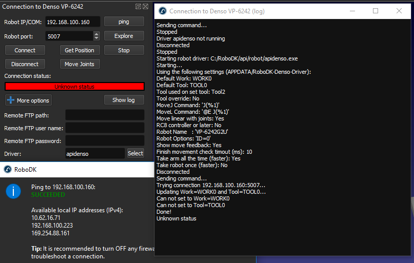 I have the latest version of Robodk and I have followed the instructions provided by robodk to connect with Denso robots. I believe I have edited the driver properly but when I try to connect the log shows this:(sc_error_1.png).