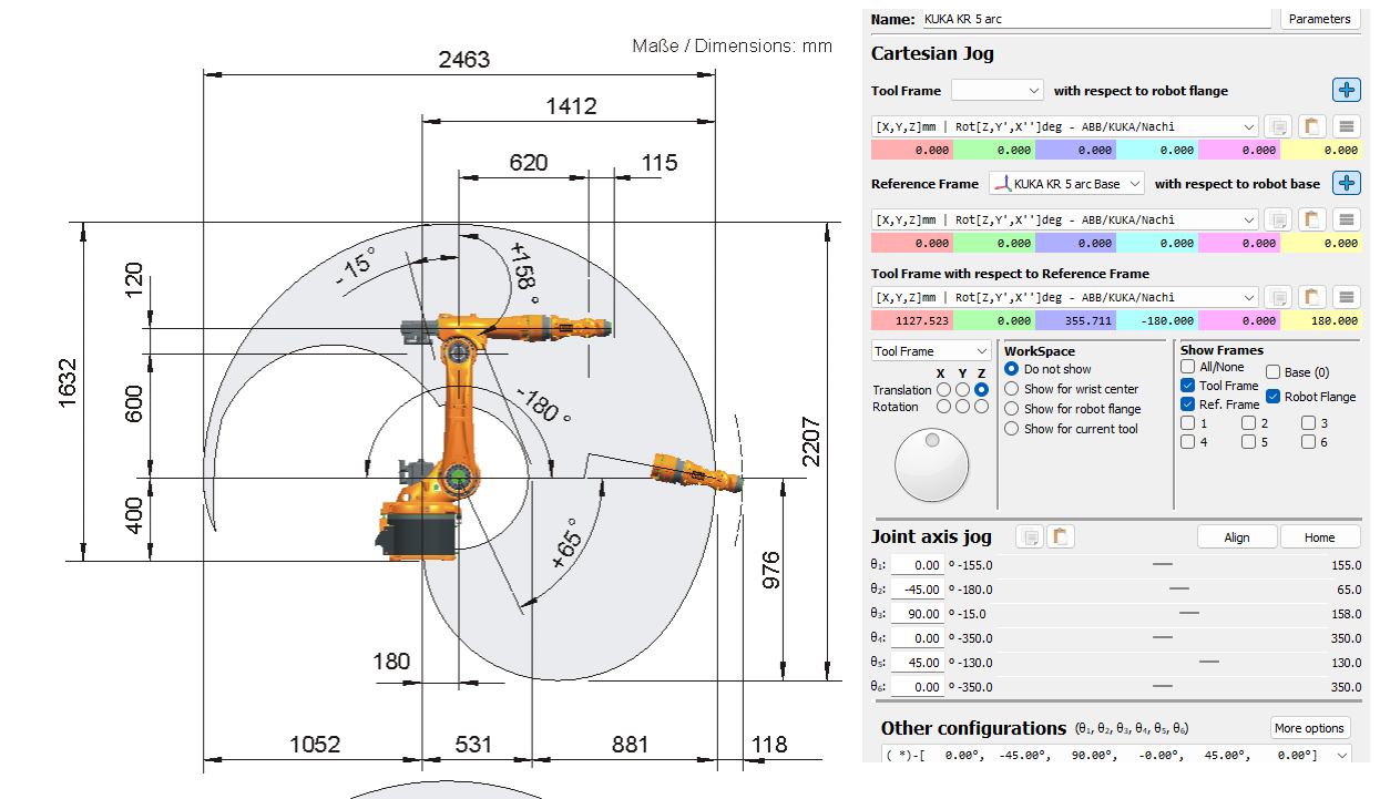 When I load this robot in RoboDK and perform axis jog for these joint angle values, I get different result even though the first component X is the same (scaled to mm from meters).