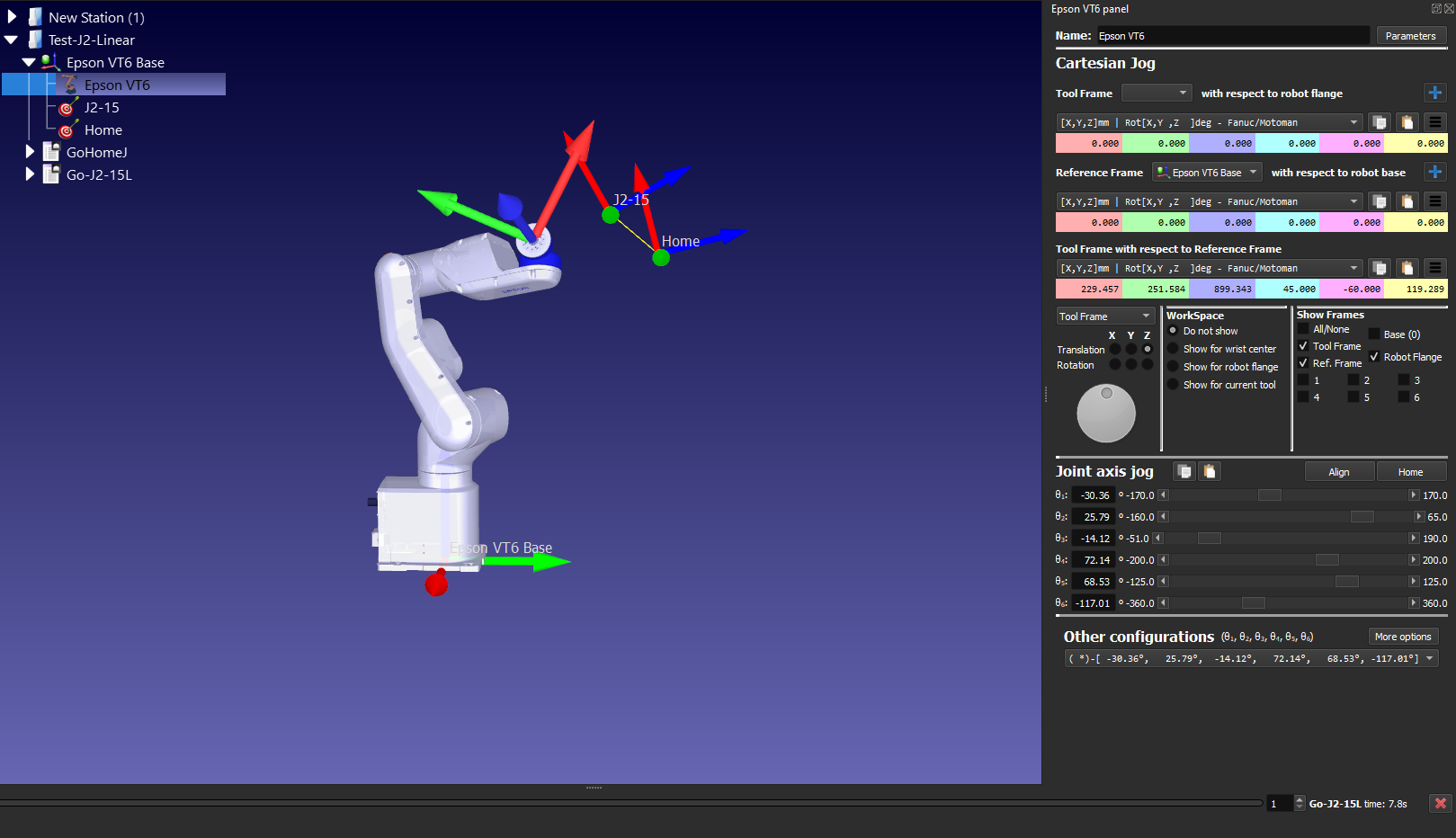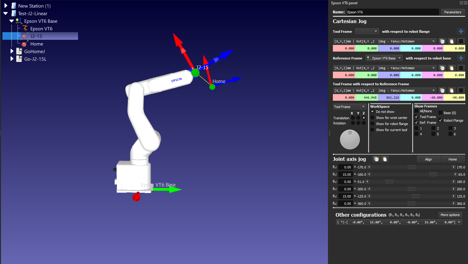 I am working with an Epson VT6L arm and am noticing lots of inconsistencies between simulated position and actual position when attempting linear movements. Everything works well in simulation, but the robot does not move as anticipated when executing the commands. I have experienced this when working with multiple different joints but I will include screenshots of the results and the RoboDK environment when only trying to move joint 2. I would like to note as well that I can only run linear moves in high power mode, otherwise I receive error 4241 (over speed during low power mode detected) even when setting a considerably lower speed and acceleration.