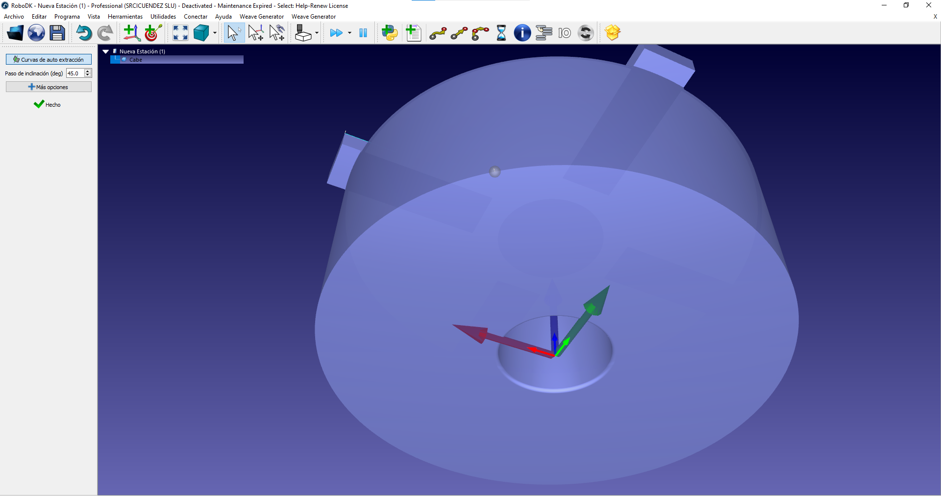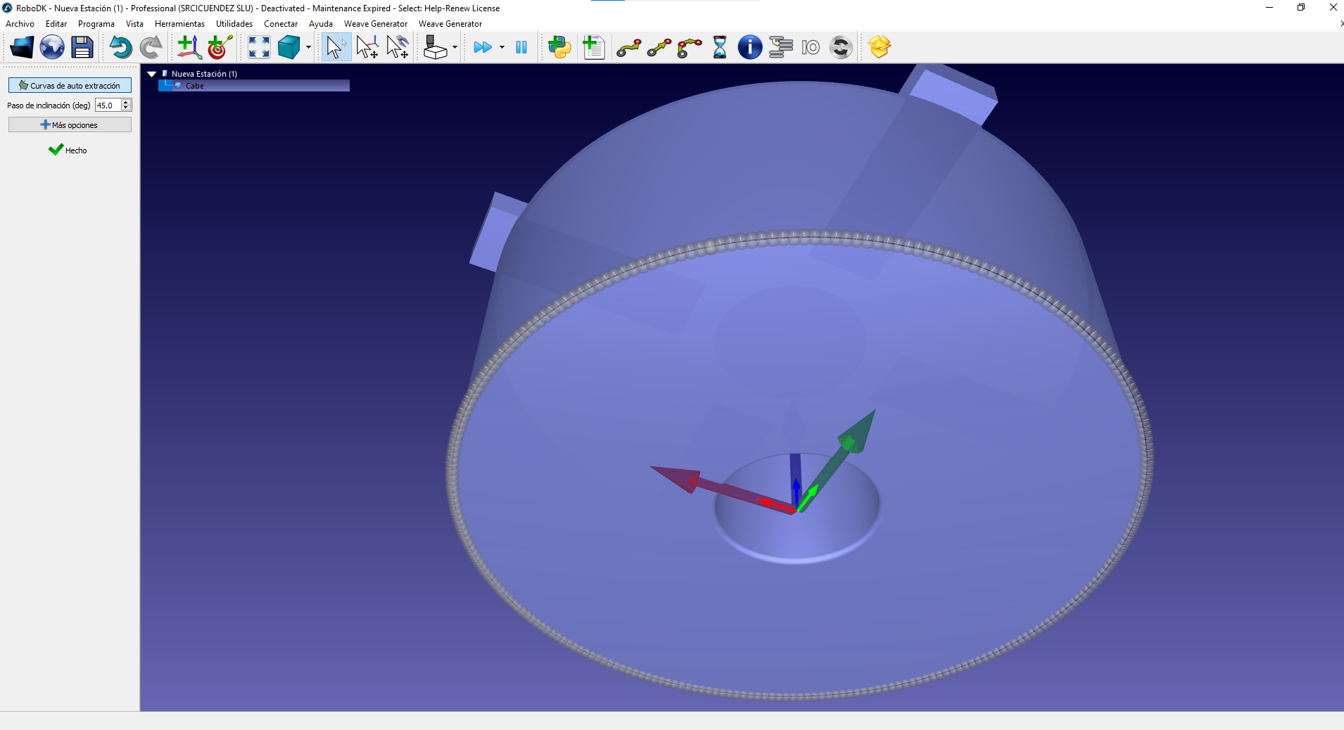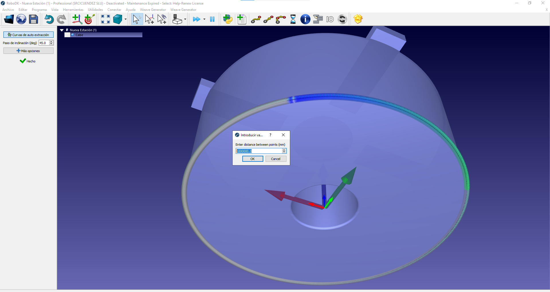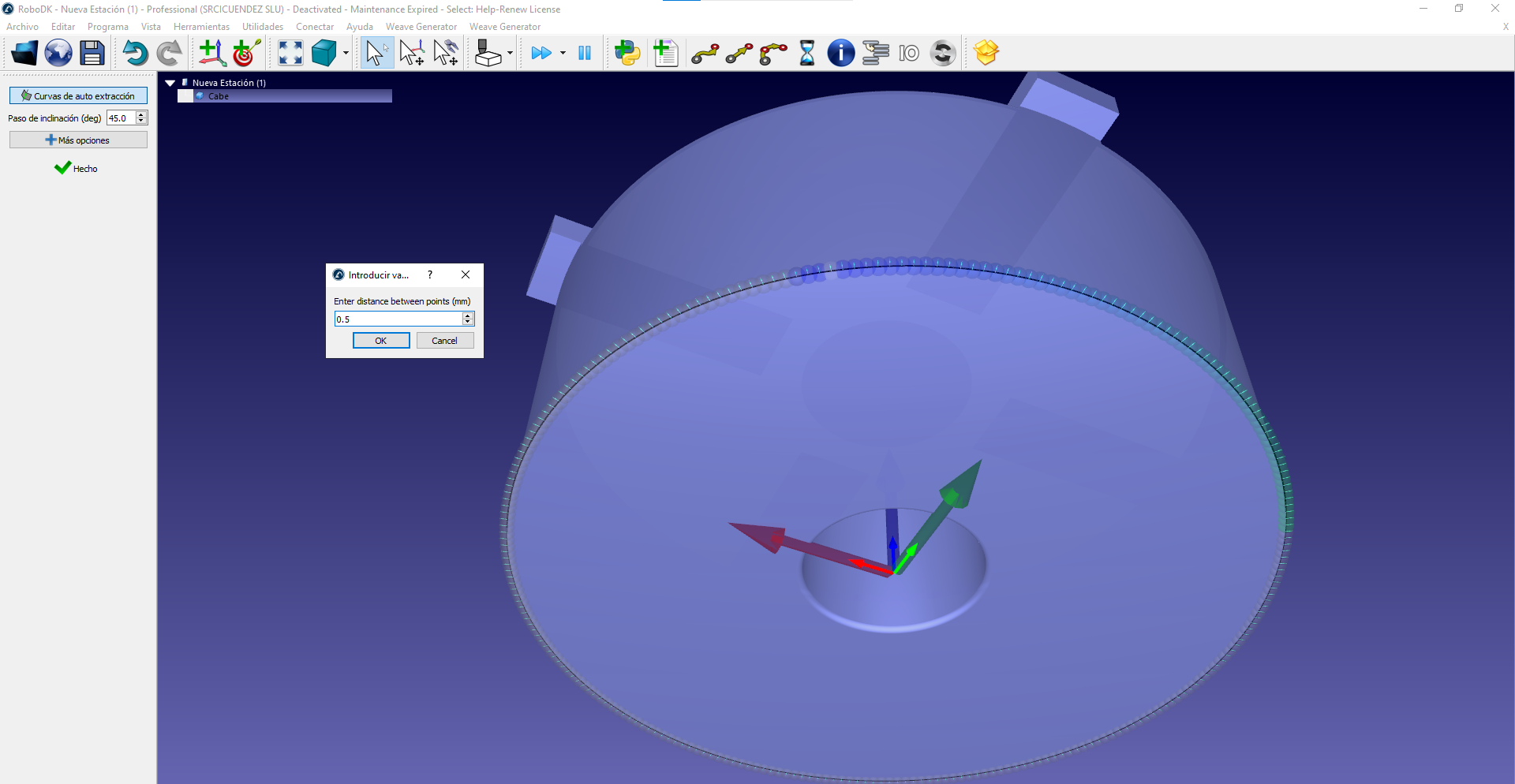 En muchas ocasiones genero una curva sobre un objeto y al modificar la distancia entre puntos robodk se buguea y elimina la trayectoria, como digo es un error que pasa a menudo. En el ejemplo que adjunto si se cambia la distancia entre puntos a 0.5 ocurre el problema.