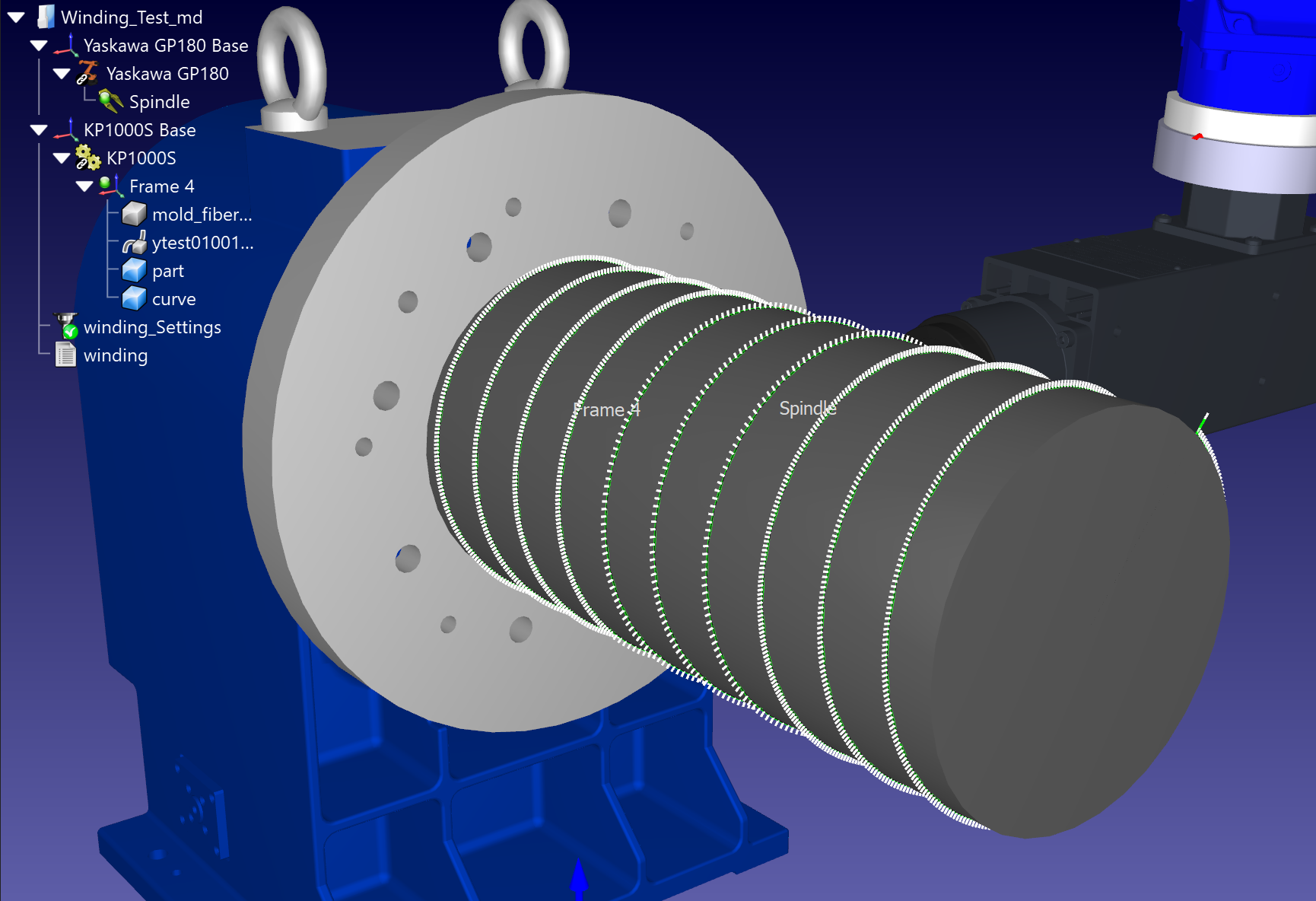 The work was carried out by synchronizing the external axis and the robot and loading the winding igs file and modeling stp file.