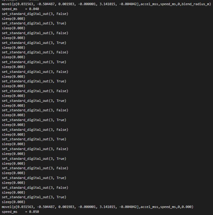 I want to drive a stepper motor by sending steps through the I/O outputs. I can do it but my problem is that my extruder is not synchronized with the movement of my robot... My extruder works at first, then my movement is done...