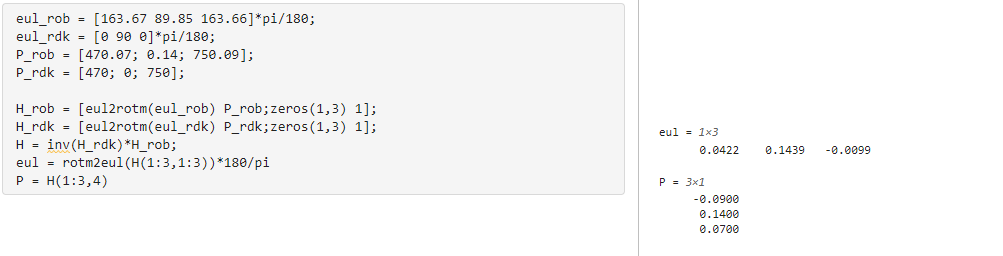 To correct this, I attempted to calculate the necessary transformation (rotation + translation) using a MATLAB script (attached image). I then input the resulting values under Robot → Parameters → Tool (Flange) in RoboDK. After doing this, the position (XYZ) appears to match, but two of the Euler angles are still significantly off. Did I calculate the 6 values (XYZ and Euler angles) incorrectly? Is this the right approach to align the flange frame? How should I correctly adjust the flange pose so that both systems are fully aligned?