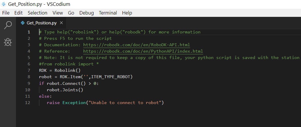 raise Exception("Unable to connect to robot")Is that what you meant by "Did you "import" Robolink in your python program."?