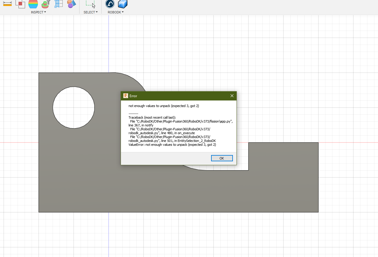 hello, so im new to this program and I have been watching the instruction videos. I'm trying to import a piece i made in fusion360 to robodk to lasercut it. however, there is no problem in loading the model into robodk but when I try to load the curves I select the curves and the faces and when i tick yes to proceed fusion gives me an error