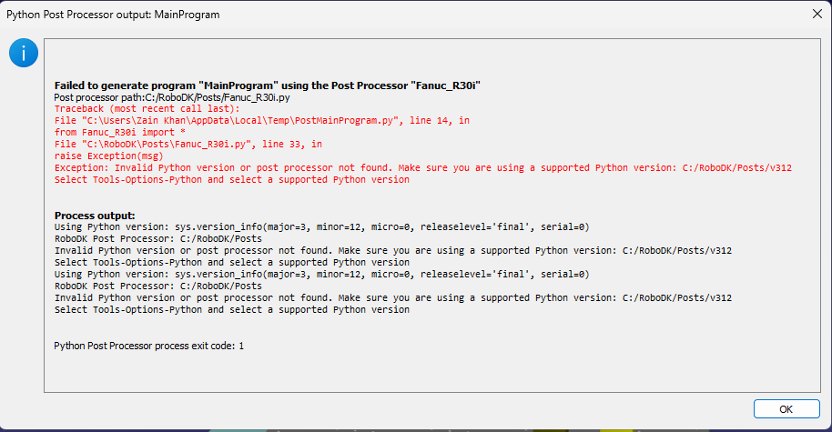 I am trying to generate a robot program to run it on my Fanuc robot. The simulation file is Lab_setup.rdk (attached). However, it is giving me an error (a screenshot of the error attached).