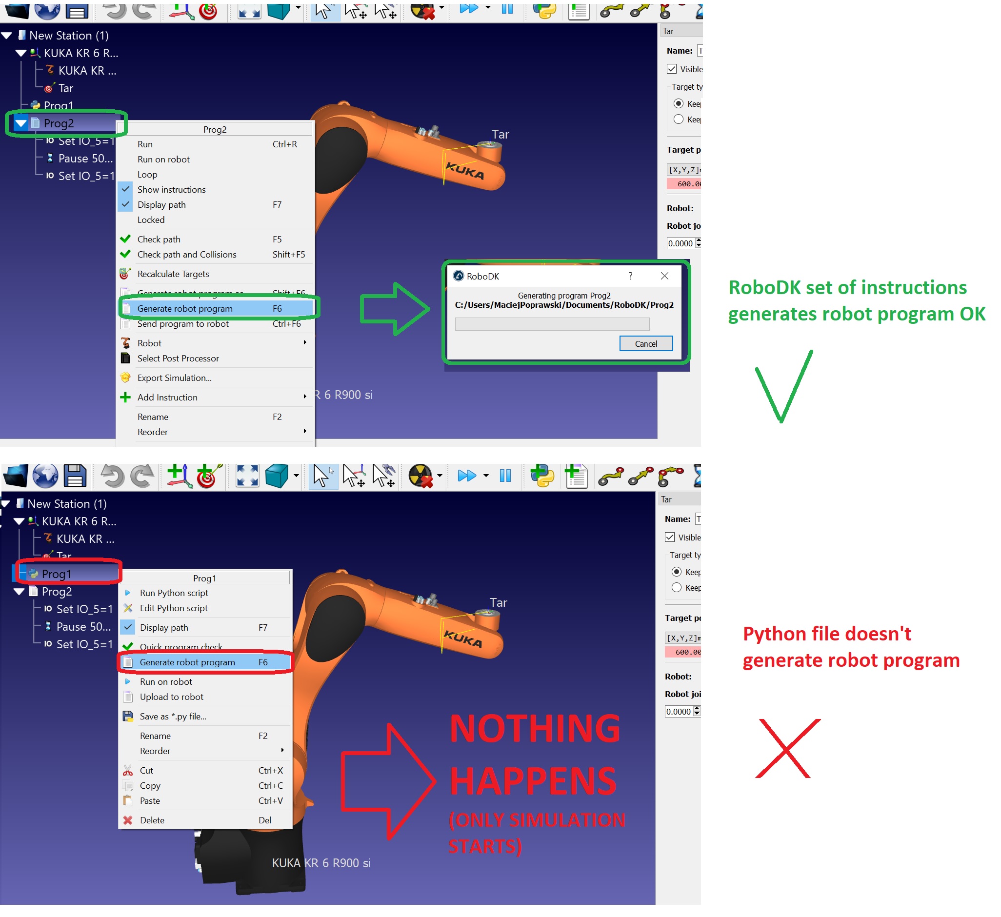 When I right-click on python file to "Generate Robot Program (F6)" it doesn't do anything (creation of SRC file would be expected). It starts the simulation, which runs properly but doesn't save any output file. To make sure it is not a post-processor issue, I created another program in the same station, this time as set of RoboDK instructions - that one always generates src output properly.