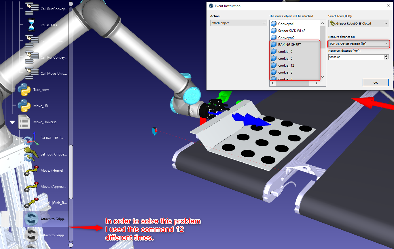 I'm trying to grab an object (tray) using a robotiq gripper. I have other objects on the tray (cookies) and I haven't been able to grab the tray with the cookies together. I'm using an event instruction command (image attached) and selecting the 12 different cookies and the tray but the gripper is only able to move the tray but not the cookies. Two questions: