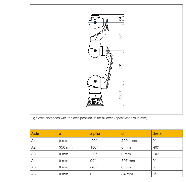 The drawings of the robot and the Denavit-Hartenberg parameters are the next: