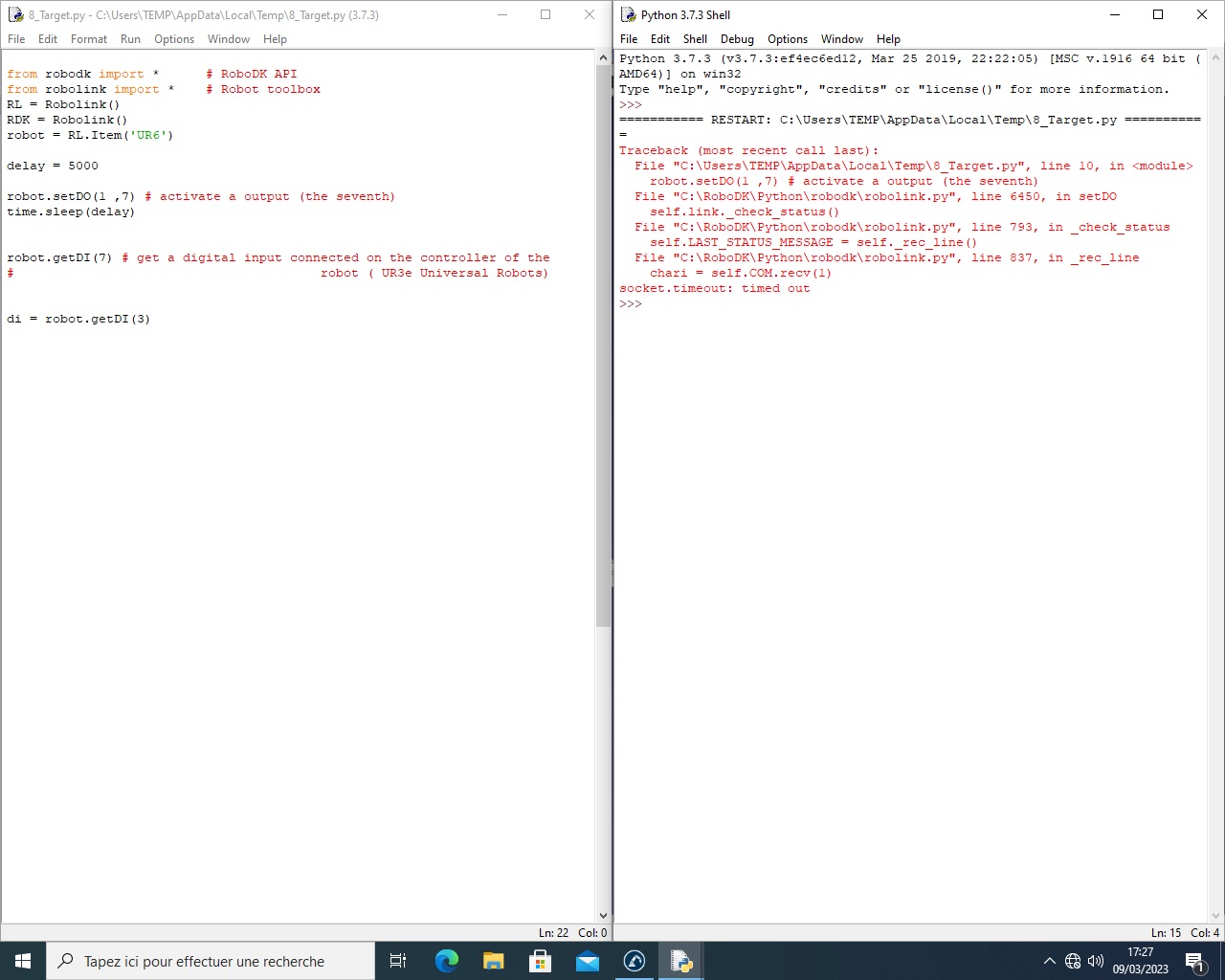 I tried to activate an output and an input on robodk with a python program but it doesn't work, I have a UR3e Universal Robots with his controller.